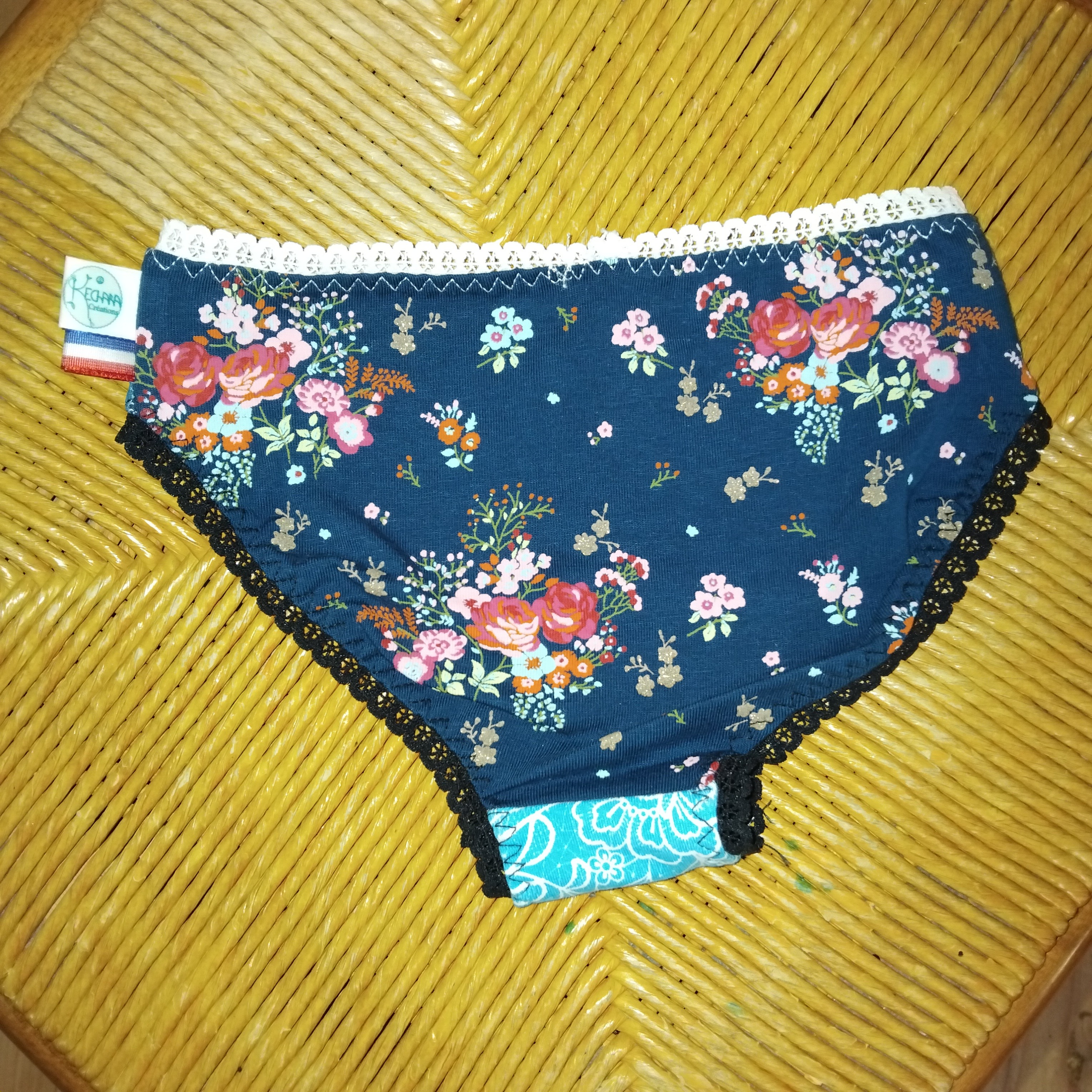 Culottes filles taille 4 ans cousues dans des chutes de découpe, fin de rouleaux, rouleaux avec défaut partiels. Jersey de coton + élasthanne certifié sans substances toxiques pour l'homme ou l'environnement.