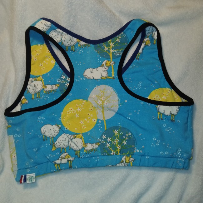 Brassière en jersey (coton + élasthanne, chutes de découpe neuves, certifié sans produits toxiques pour l'homme ou l'environnement), avec une bande élastique sous poitrine.